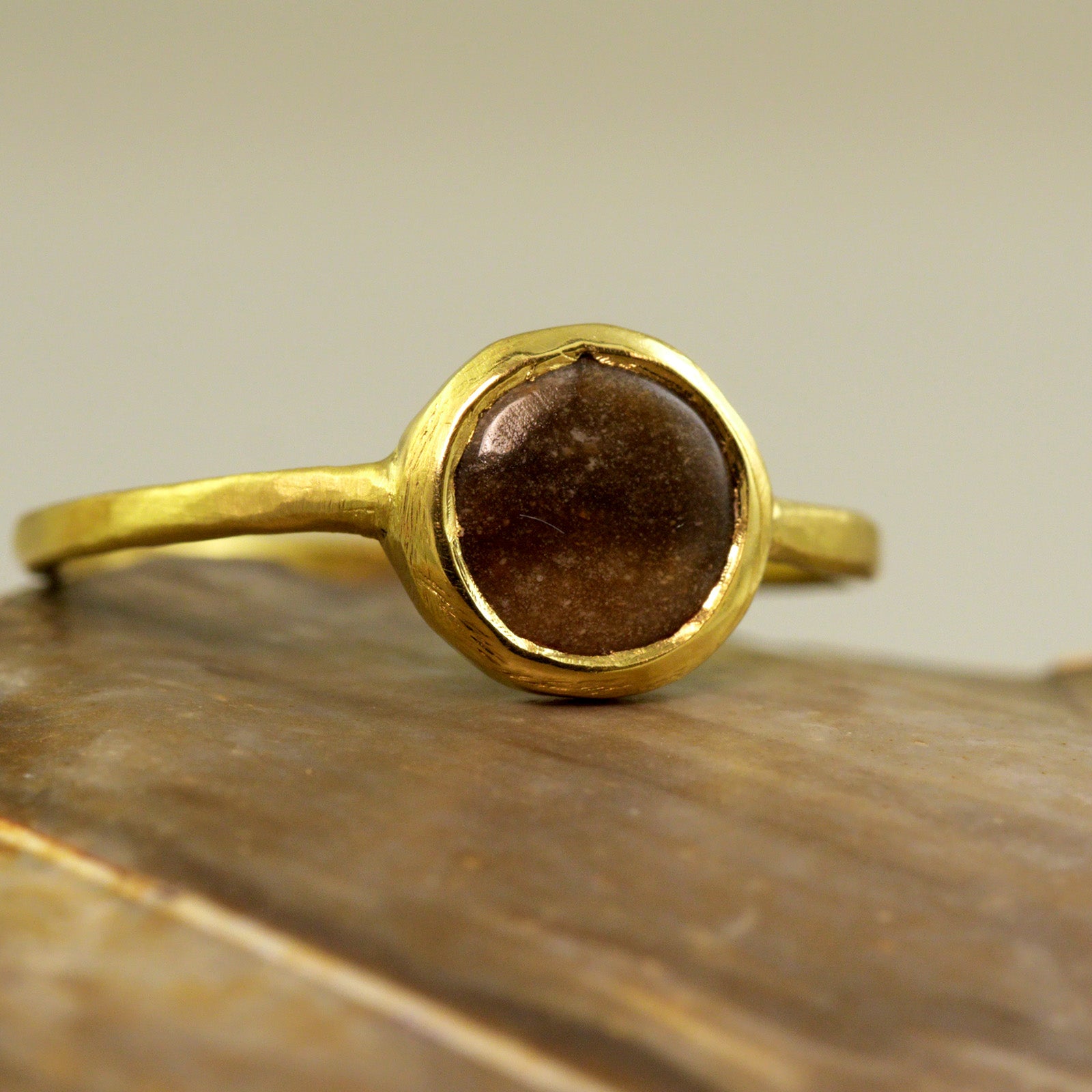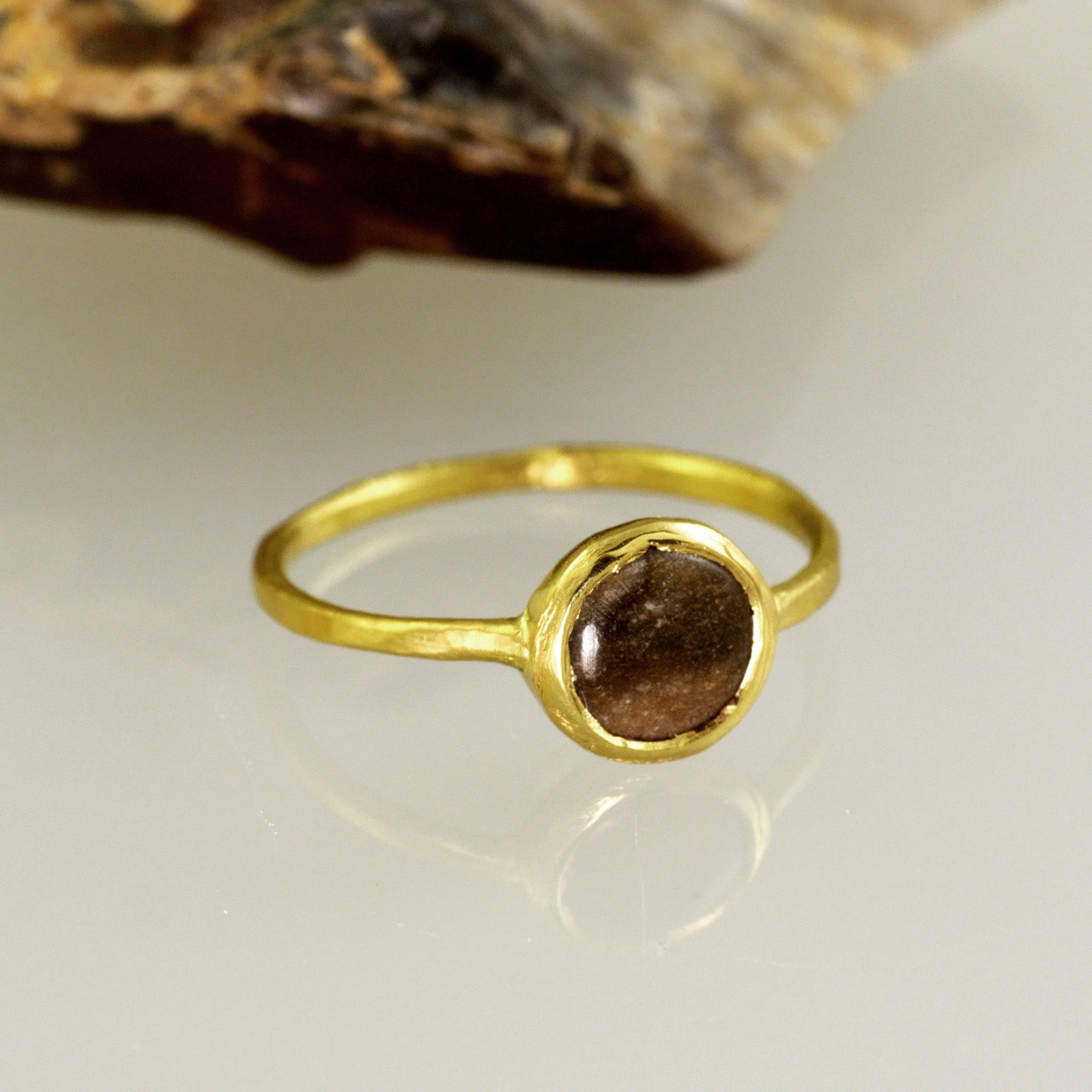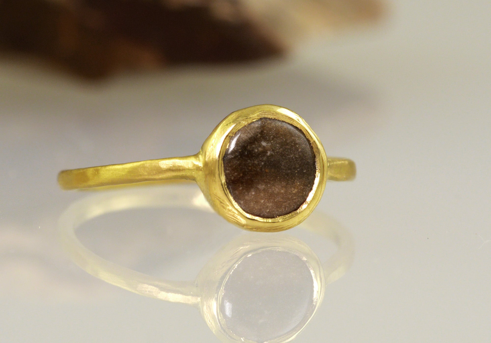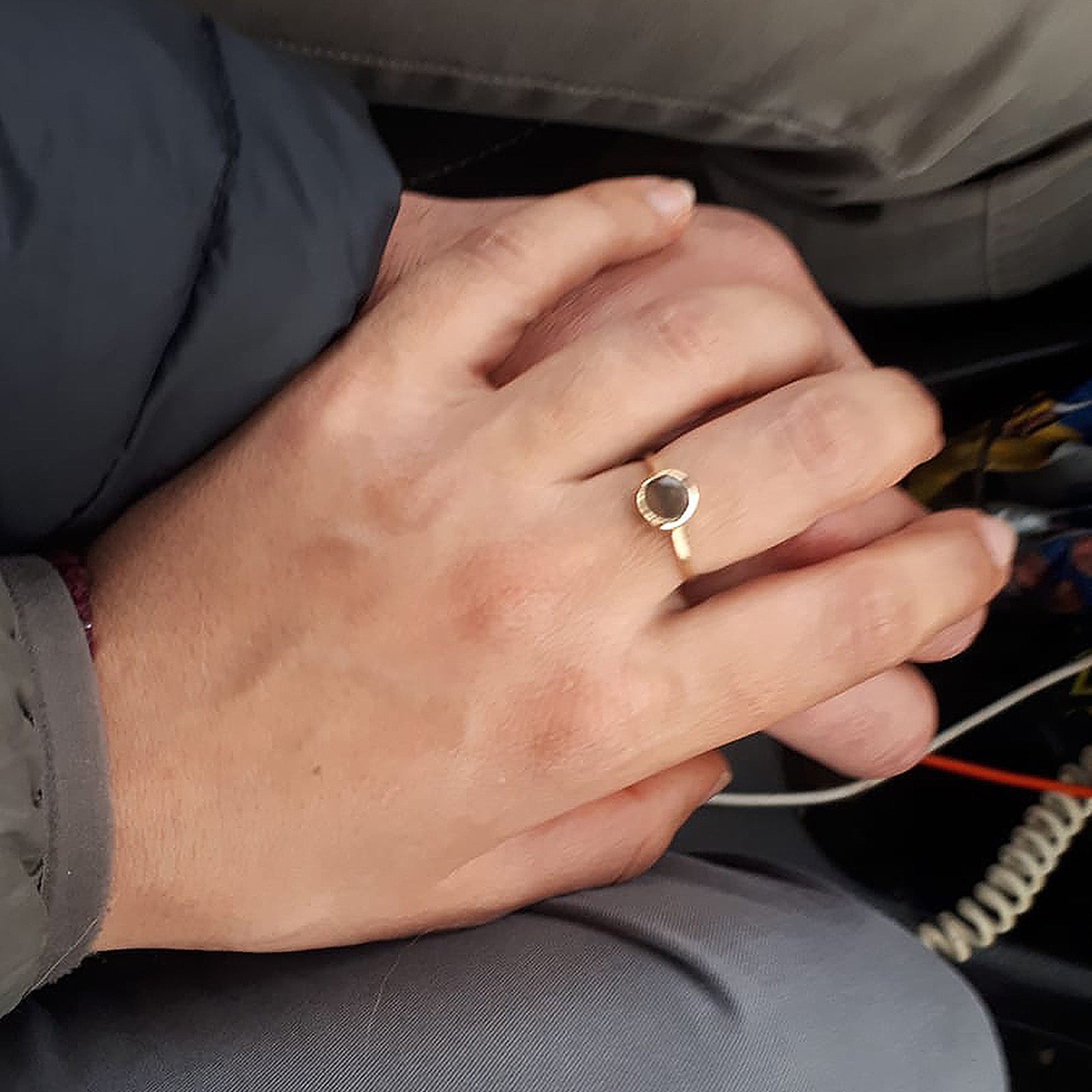 אני שמחה תמיד לעזור בהגשמת חלומות, ובייחוד כאלו מרגשים ורומנטיים. הטבעת עשויה מזהב צהוב 18 קראט ומשובצת בפיסה מאבן הצור המקורית שהובאה אלי, ושעברה תהליך חיתוך וליטוש ייחודיים. יעל לא מורידה אותה מאצבעה, מאז, כסמל לאהבתם שהחלה במרחביו האינסופיים של המדבר.