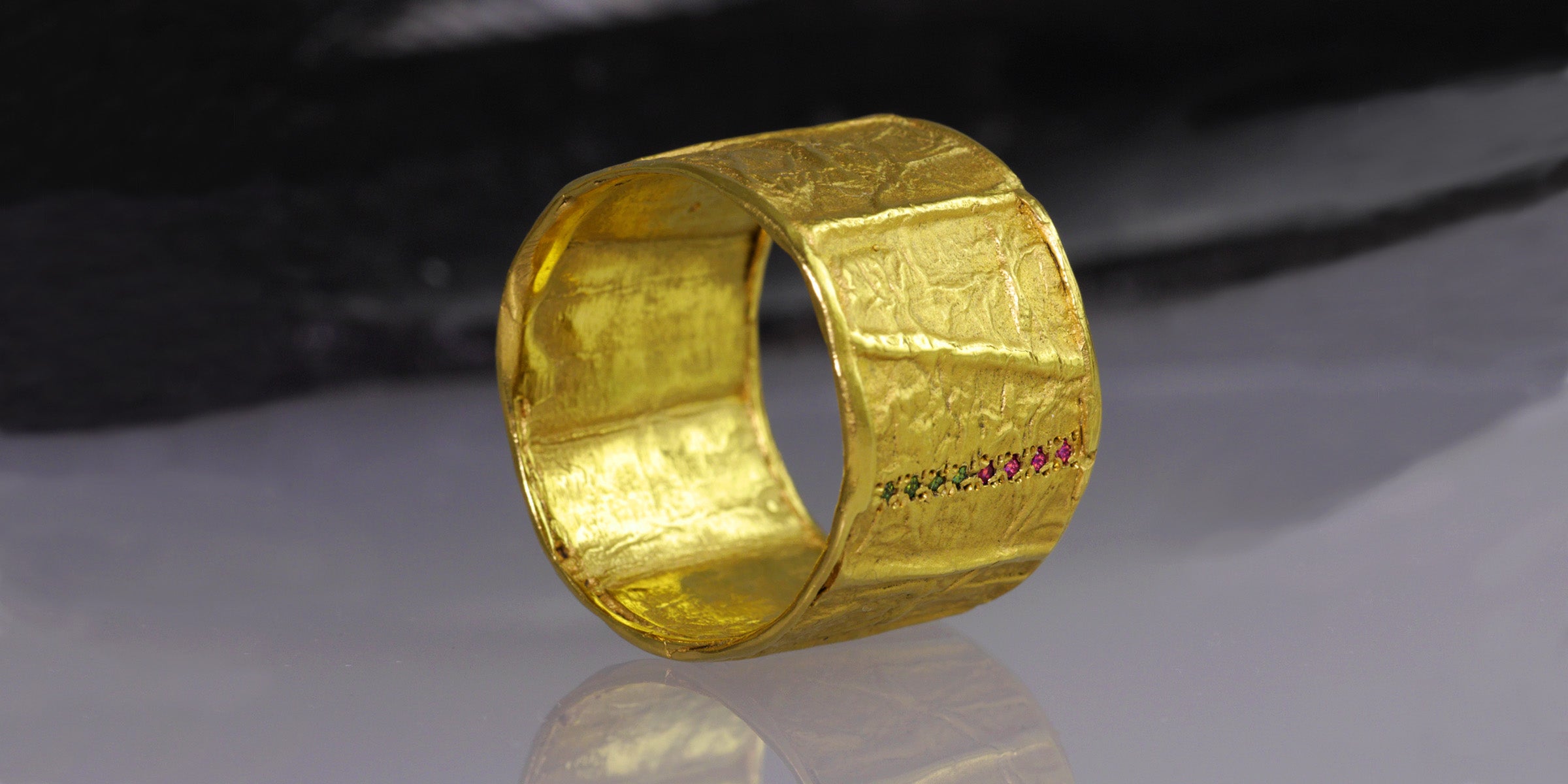 טבעת זהב רחבה, 18 קראט, עם אמרלד ורובי
