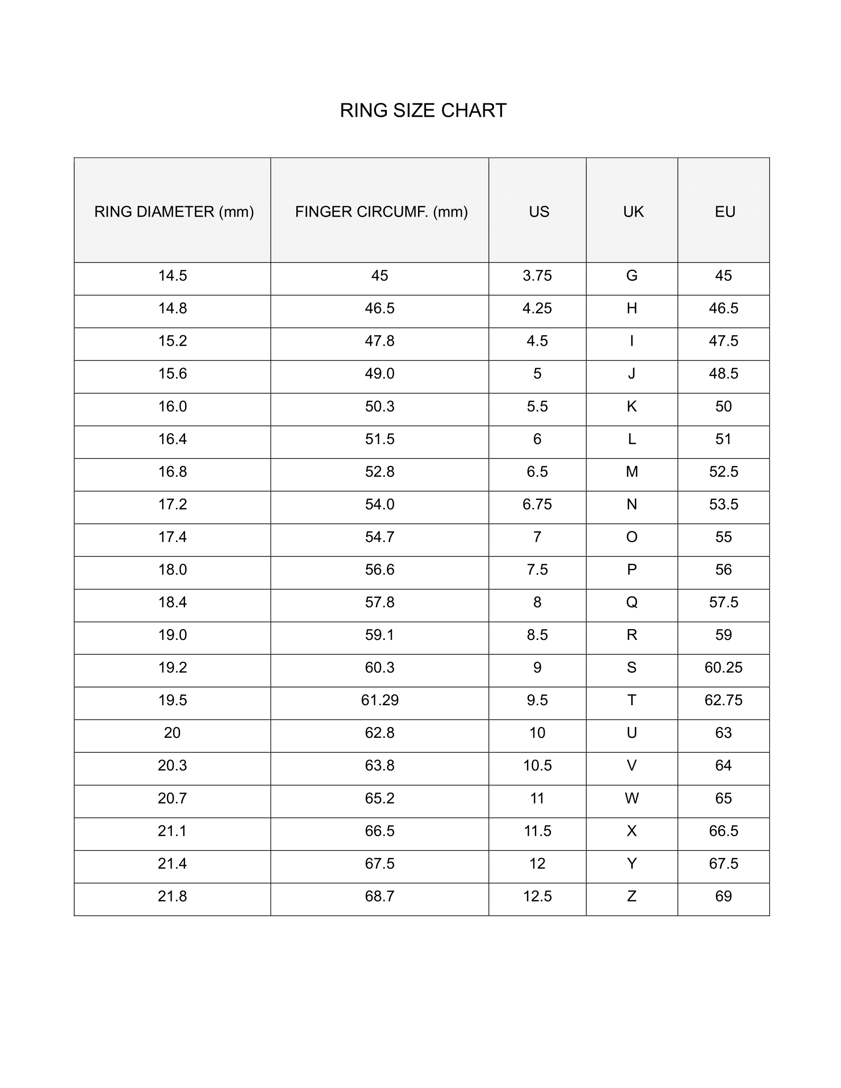 מדדו את הקוטר הפנימי של הטבעת במילימטרים. העזרו בטבלה למטה כדי לקבוע את מידת הטבעת או הדפיסו והעזרו במדריך המידות להדפסה שלנו כאן למטה.
