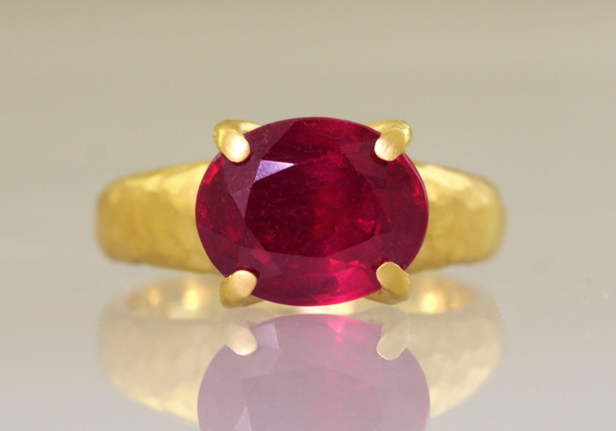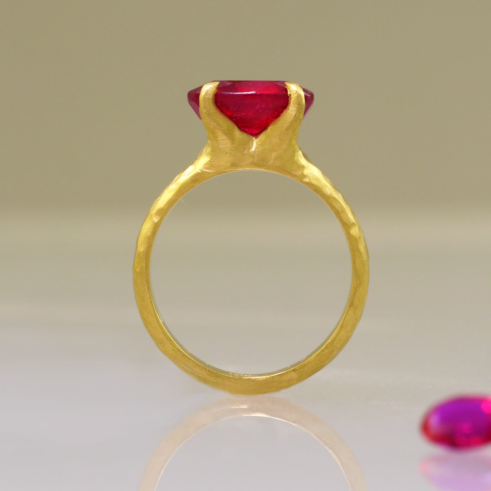 רג'אסטן - (ארץ הנסיכים), המדינה השנייה בגודלה בהודו, ארצם של ה"מהרג'ות, המבצרים העתיקים, הצבעים, המקדשים ובעיקר מרכז עתיק יומין לסחר באבני חן. לאיזבל, לקוחה ותיקה ומסורה, שהיא גם חברה טובה שלי, היה חלום: לקנות אבן רובי אמיתית בצורת אליפסה ולעצב ממנה טבעת ייחודית שהיא רק שלה. בקיץ 2018 טיילו איזבל ובעלה בהודו והחליטו שהם חייבים למצוא את אבן הרובי שאיזבל רוצה. לאחר שיטוט בין אין ספור חנויות וסוחרי אבנים יקרות, הם מצאו את מבוקשם. אמנם לא אבן רובי אמיתית מדרגה AAA שמחירה מרקיע שחקים, אלא אבן סינטתית באיכות גבוהה במחיר שהיה אפשרי להם ונראית מדהים. כאשר איזבל הגיעה אלי עם האבן היא לא היתה סגורה עם עצמה מה היא רוצה בדיוק. היא חיפשה שילוב של תכשיט קלאסי עם עיבוד טבעי יותר. לאחר תהליך לא קצר של החלפת דעות וחיפוש אחר העיצוב הנכון לה עיצבתי עבורה טבעת שהיא מאד קלאסית במבנה אבל מרוקעת בעבודת יד למראה טבעי ואורגני ומכיוון שהאבן מקורה בהודו רציתי שהזרועות התומכות באבן יקבלו איכות של ארבעת הפילים התומכים בכדור הארץ מהמיתולוגיה ההודית